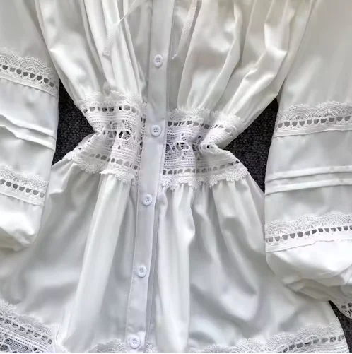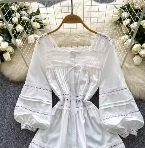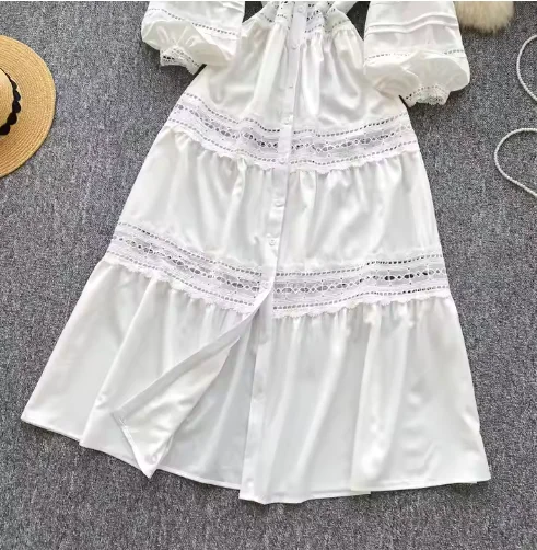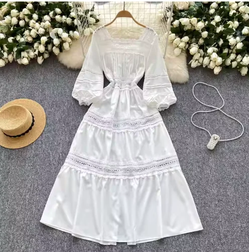 High-End A-Line White Lace Dress Minimalist Casual Midi Square Neckline Button Decoration Hollow Patchwork Solid Sweet Natural